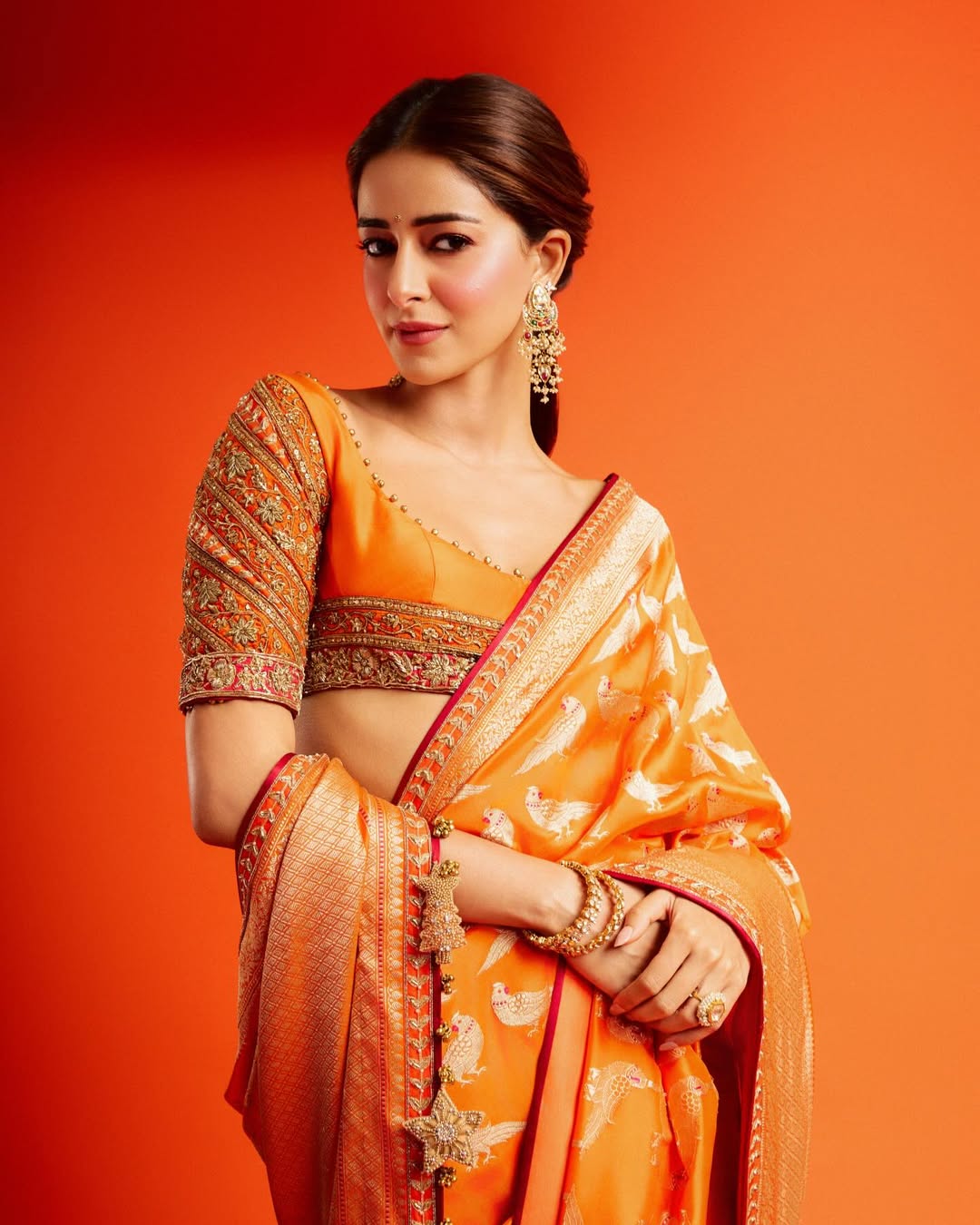 నటి అనన్య పాండే తన అభిమానులతో ఒక ఫోటో షేర్ చేశారు, అందులో ఆమె ప్రకాశవంతమైన నారింజ రంగు బనారసీ బ్రోకేడ్ సారీలో కనిపించారు. ఈ సారీ స్వదేశ్ ద్వారా తయారు చేయబడిన హస్తకార శిల్పాన్ని ప్రదర్శిస్తుంది.